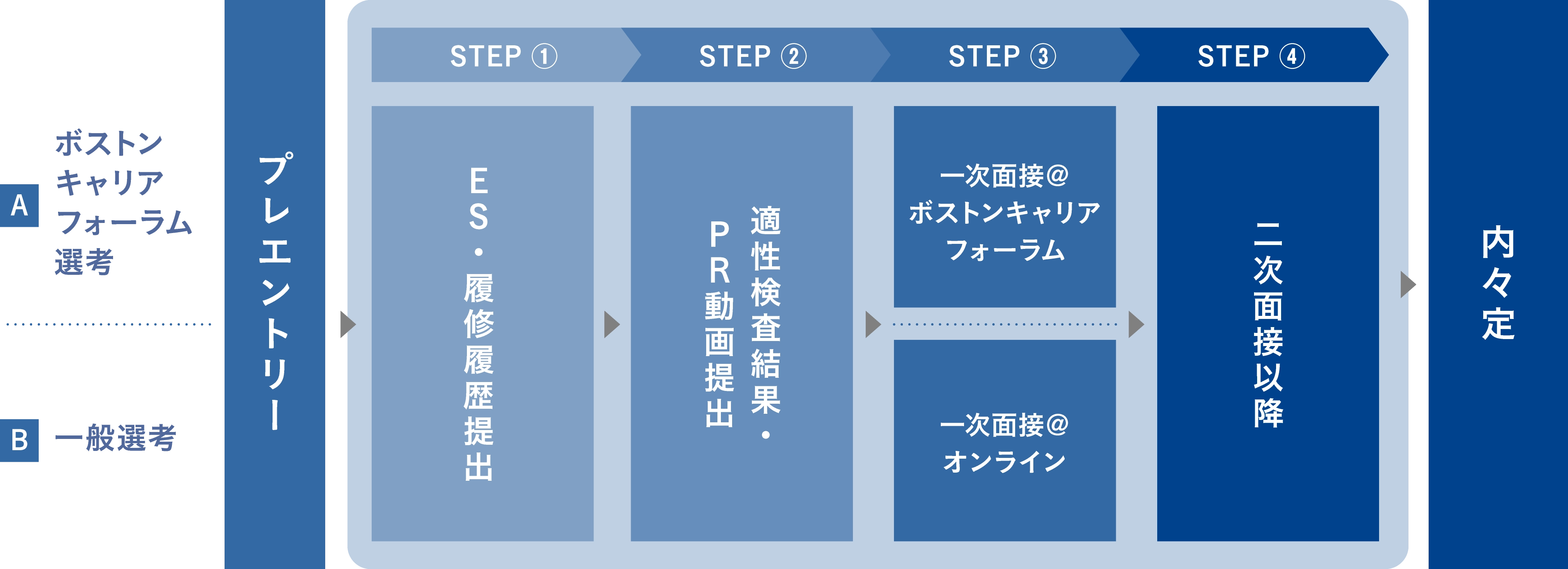 ※ ボストンキャリアフォーラム選考は一次面接を現地で実施いたします。